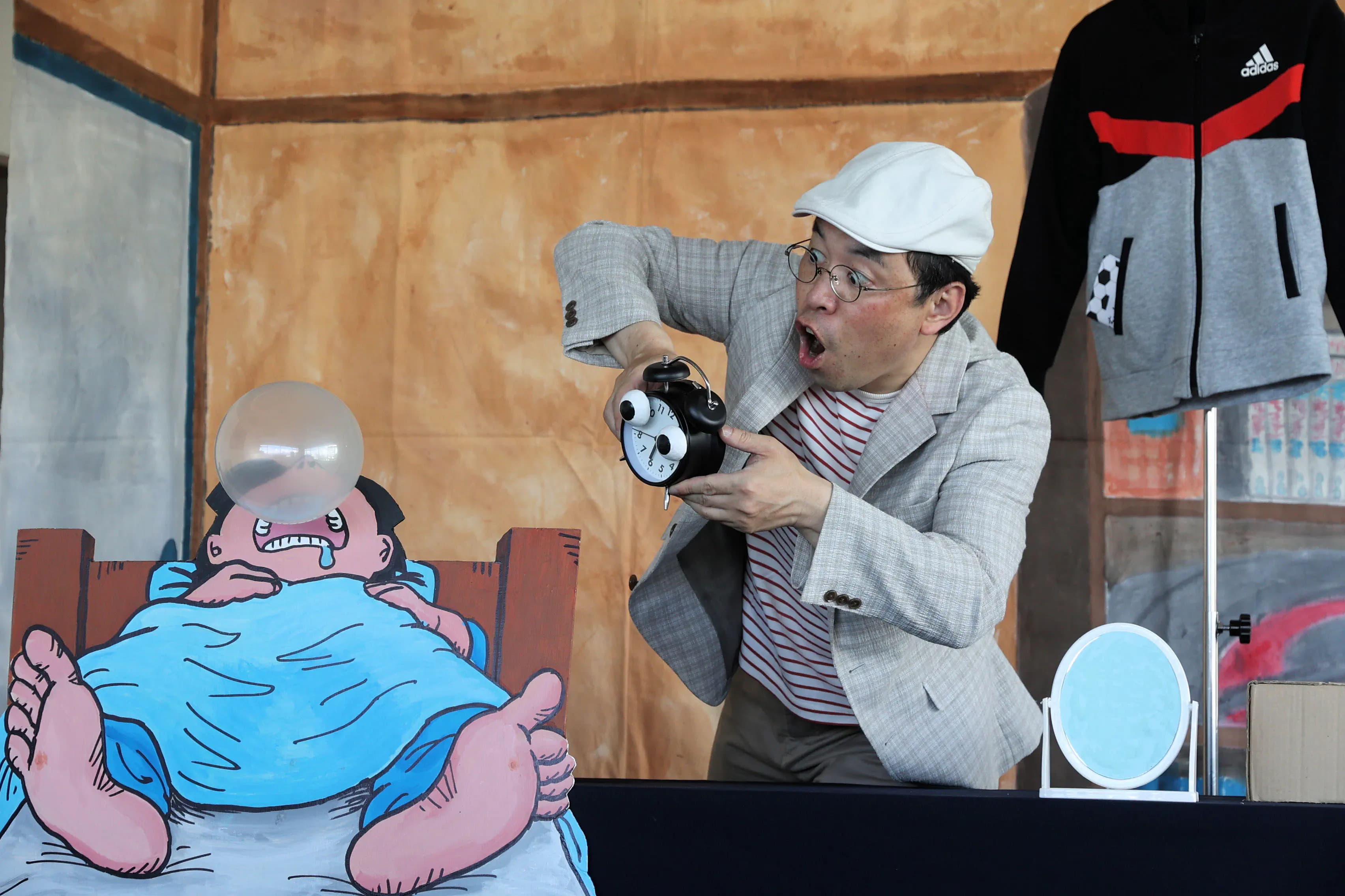 『起きろ!』は、子どもから大人まで楽しめるドタバタ系の一人芝居。シアター奇望堂の唯一のレパートリーですが、毎年少しずつブラッシュアップしています。