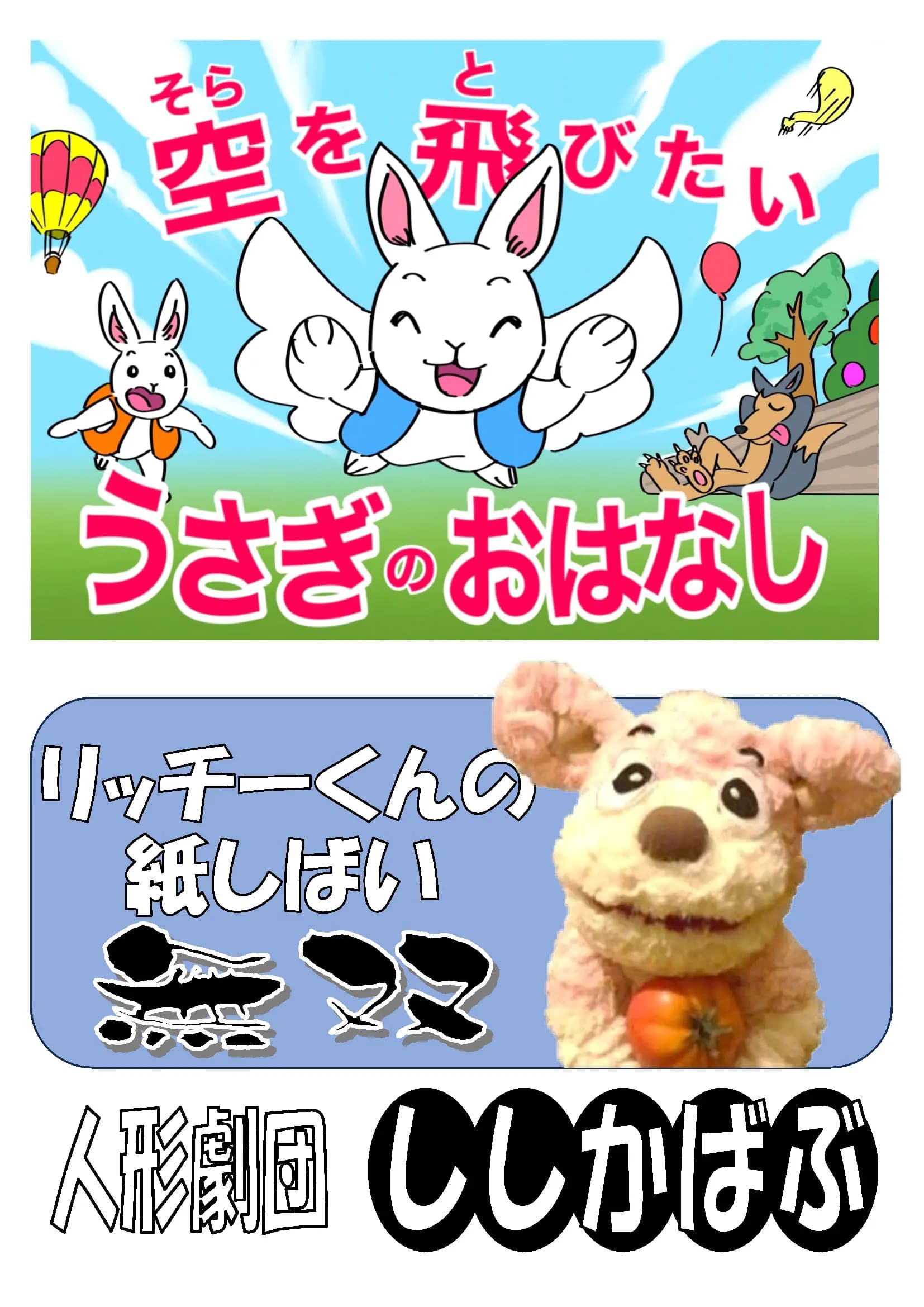 『空を飛びたいうさぎのおはなし』 空を飛びたいうさぎのホッピーと、お兄ちゃんのハッピーは、風船の実を探しに森へ向かいます。そこにオオカミのグルルが......。さあ大変