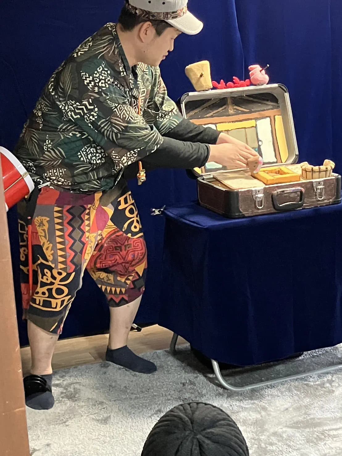 イジワルなさるは、かにが持っていたおにぎりと柿の種を交換しました。柿の種を植えると......有名な日本昔話「さるかに合戦」をテーブルシアターで上演します。効果音もBGMもすべて一人でやります!お楽しみに。
