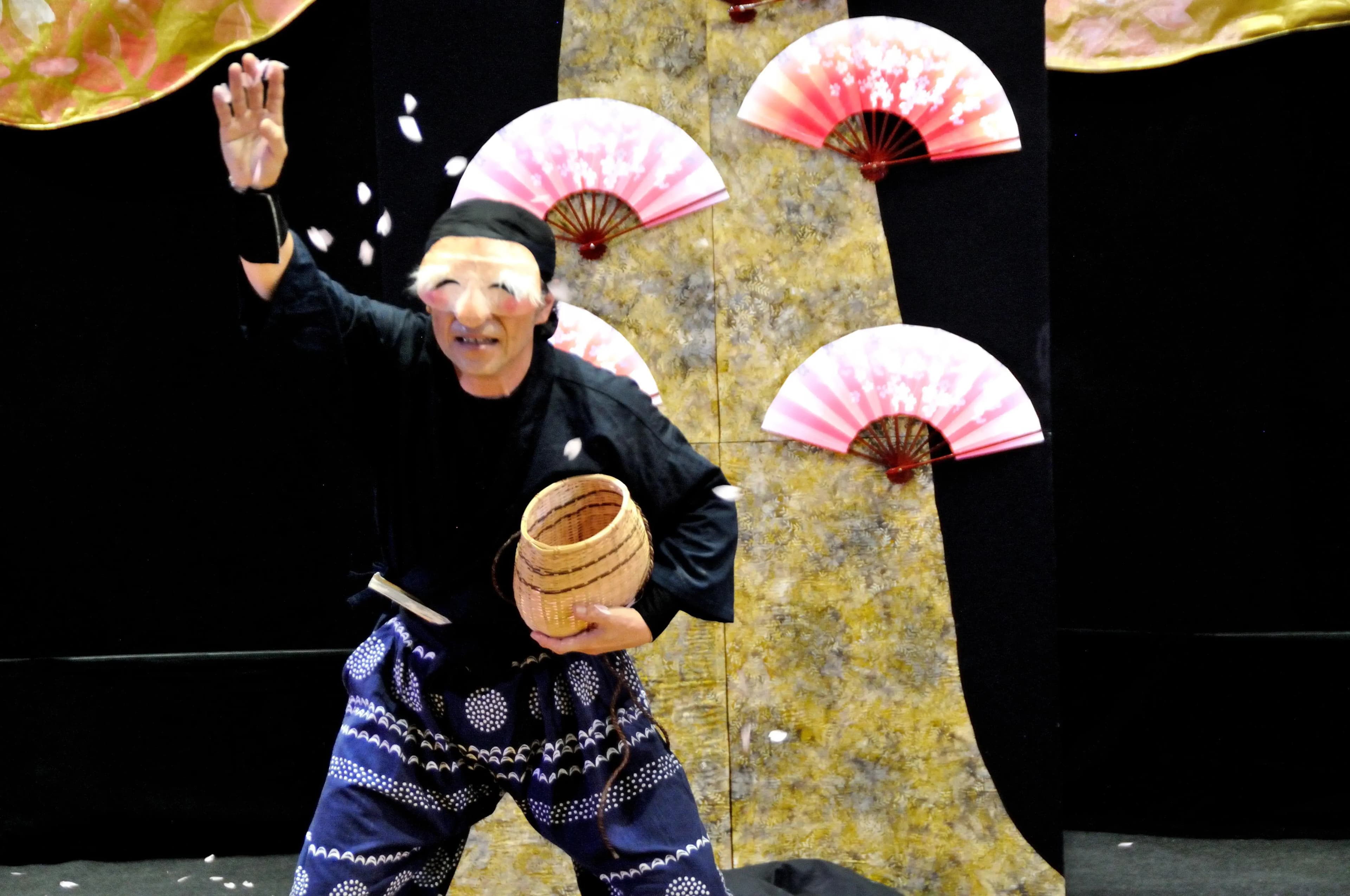 見立て、仮面 「枯れ木に花を咲かせましょう」 日本の死と再生の物語を、仮面と扇による見立てでユーモラスに、そして美しい舞台にしました。人形芝居燕屋と創作芸能・吟遊打人とのコラボレーション。フェスタでは最後の上演になるかもしれませんので、お見逃しなく。