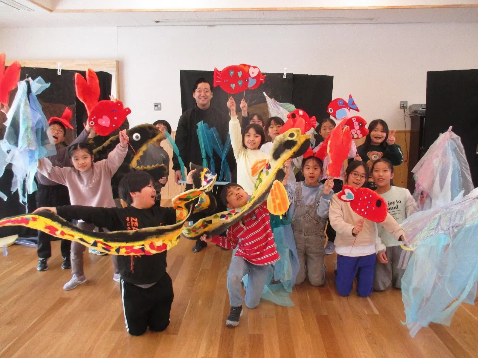浜井場小学校4年生は、昨年「ハッピー笑顔プロジェクト」に取り組み、地域の方を笑顔にする活動に取り組んできました。プロジェクトパート3では、保育園・幼稚園の皆さんを笑顔にしたいと願い、人形劇に取り組みました。今回は、その時に上演した『スイミー』をもっと多くの皆さんに鑑賞していただき、笑顔をお届けできるように、フェスタに参加することにしました。どうぞご覧下さい。