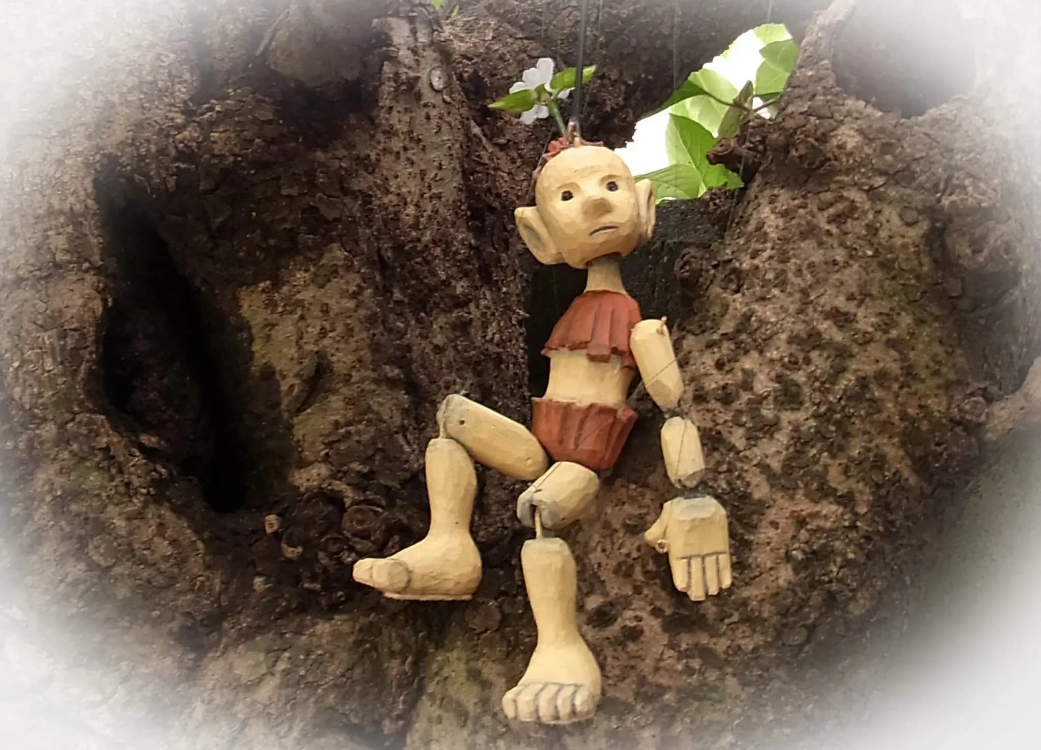 客席はひとつだけ!木の形をした舞台の穴をのぞいてね。木彫りのマリオネットが、あなたのために人形劇します!
